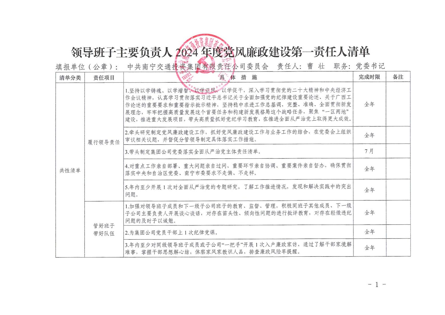 領導班子其他成員2024年度黨風廉政建設“一崗雙責”清單(一)