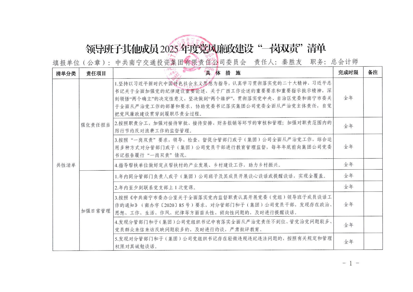 南寧交投集團(tuán)領(lǐng)導(dǎo)班子其他成員2025年度黨風(fēng)廉政建設(shè)“一崗雙責(zé)”清單(六)