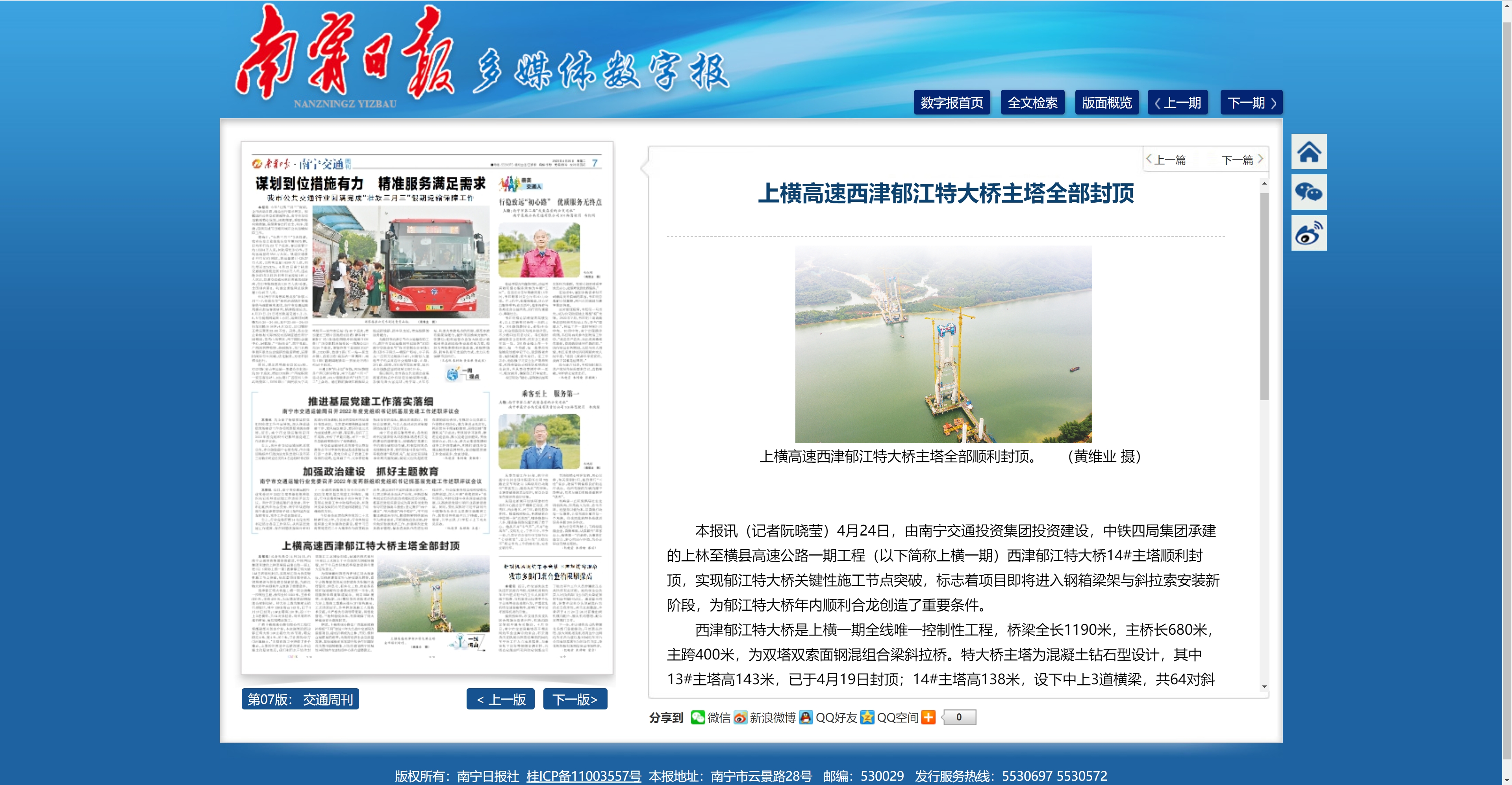 上橫高速西津郁江特大橋主塔全部封頂